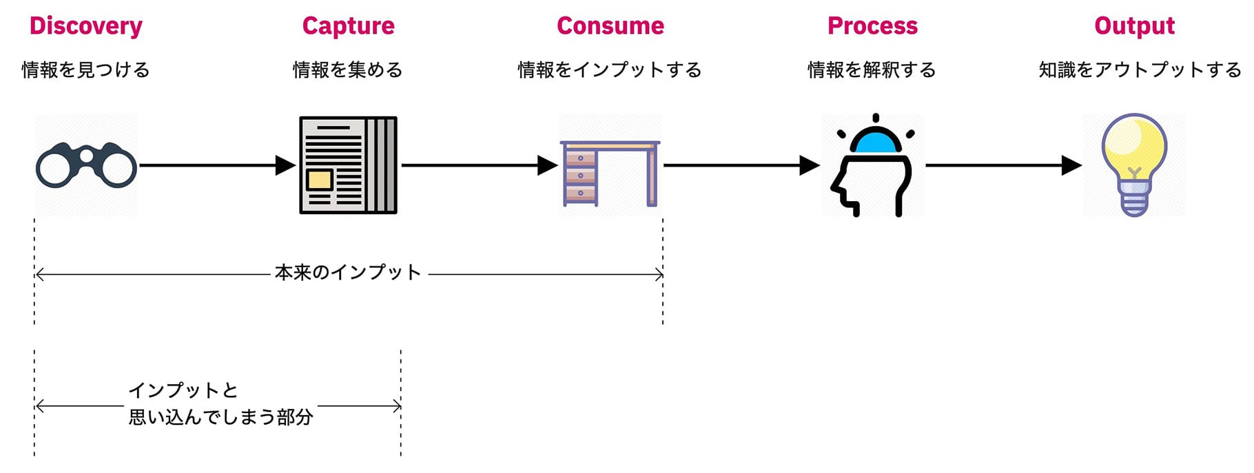 情報過多による疲れも問題ですが、個人的にもっと問題だと思っているのが情報過多によるインプットの勘違いです。流れてくる情報があまりにも多いので、Like 、ブックマーク、流し読みをして処理してしまいがちです。ただ、それだけだと情報を消費しているだけであて、自分の知識になるインプットにはなりません。